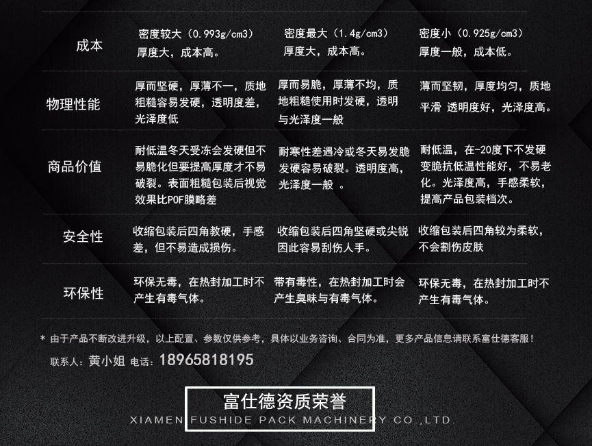 收縮過程中,不影響包裝物的品質(zhì),而能收縮快速完美,包裝后的產(chǎn)品能密封、防潮、防撞擊、適用于多件物品緊包裝和托盤包裝。