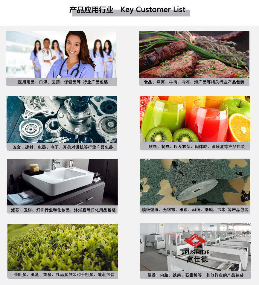 富仕德牌全自動(dòng)熱收縮膜包裝機(jī)應(yīng)用行業(yè)廣泛,專為以下多個(gè)行業(yè)產(chǎn)品提供產(chǎn)品外膜包裝: